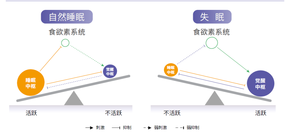 传统安眠药物主要通过抑制中枢神经系统发挥作用,虽然能够帮助入睡,但可能带来次日困倦、记忆力受影响等副作用,与理想的“自然睡眠”状态仍有距离1。近年来,科学研究发现食欲素这一"清醒开关"在睡眠调节中起关键作用。当食欲素上升时,觉醒中枢会异常活跃,令人保持清醒。相反,食欲素下降时,觉醒中枢活跃度会降低,增加睡意。如果食欲素系统失调,觉醒中心过度活跃,就可能导致失眠。这一发现为失眠治疗提供了新思路。