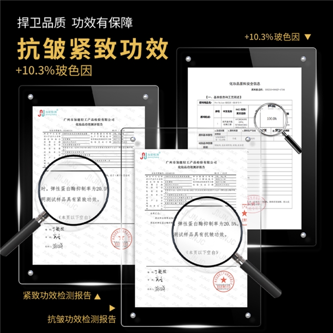 功效不是靠“感觉”,而是靠可追溯的验证。该产品通过了SGS(瑞士通用公证行)的人体功效实测,第三方检测数据显示(仅供参考):在为期28天的测试中,受试者皮肤弹性值平均提升19.7%(数据来源:第三方实验室内部测试报告);皱纹面积占比平均减少12.3%(数据来源:第三方实验室内部测试报告)。同时,其产品执行的标准编号(粤G妆网备字2024460699)和执行标准(QB/T1857(O/W))均公开可查,备案信息透明,每一步都经得起追溯。